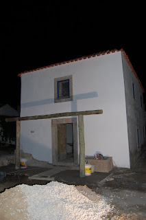Segunda-feira é sempre dia de revisão do fim-de-semana. Ora que o sábado e o domingo foram dedicados ao novo telheiro da Alegre Casinha. A zona para onde vamos morar é assim a modos que ventosa e quando o vento Sul resolve assobiar por aqueles lados não é para brincar. Se ao vento juntarmos chuva a coisa complica ainda mais. Foi a pensar nestas questões que optámos por construir um telheiro que nos servisse de abrigo e protegesse a casa. As operações foram comandadas pelo mestre carpinteiro. Depois de muita matemática definiu-se o tamanho do telheiro e as medidas exactas para as fundações. Abrimos uns buracos fundos e erguemos uns antigos postes dos telefones. Os postes de madeira das linhas telefónicas têm a particularidade de serem tratados e a impregnação da madeira com agentes preservadores faz com que adquira características de maior durabilidade e resistência a fungos e insectos, prolongando assim a vida funcional da estrutura. Depois de chumbar os postes fizemos uns furos na parede para no próximo fim-de-semana fixar metade de um poste que por sua vez vai suportar a estrutura onde vão repousar as telhas. No chão, já ao anoitecer, colocámos pedras e brita para nivelar a entrada. Ainda não enchemos no meio (onde está aquele estrado de madeira) por causa dos tubos para os cabos eléctricos. Quando houver tempo e dinheirinho pavimentamos o chão, ainda que não saibamos bem como...