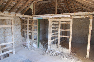 Neste fase andávamos nós de escopro e maceta na mão a picar paredes, cheios de pó até às amígdalas. Sei lá eu quantos baldes de entulho nós carregámos...Quando tivemos acesso a electricidade começámos a usar o maravilhoso martelo eléctrico que deu uma precisosa ajuda bem como uma incrível dor nos braços. Depois de picar tudo e mais alguma coisa, tirar tudo o que era reboco solto, tivémos de encontrar ânimo aqui: